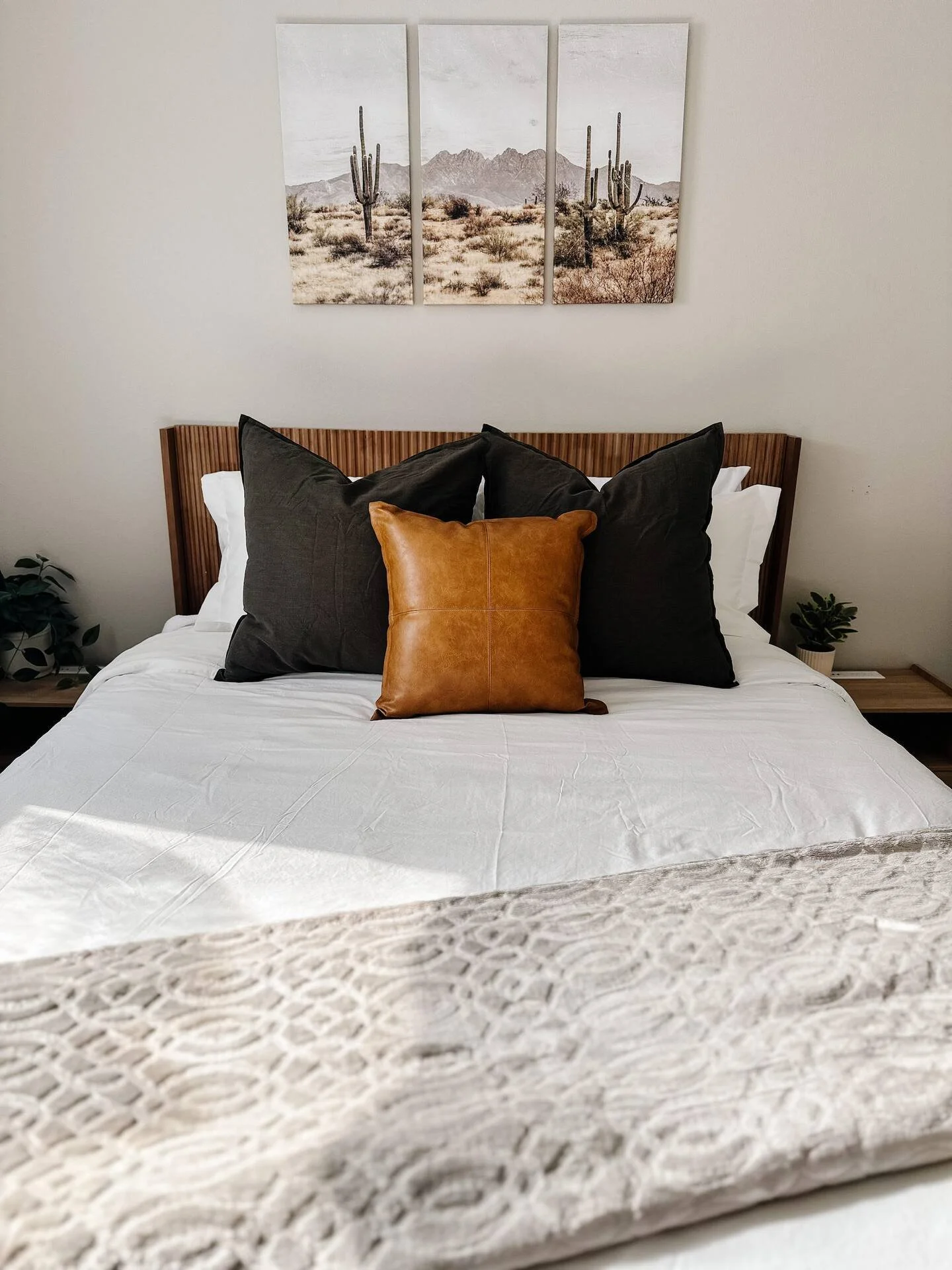 • A neatly made bed with a white comforter and decorative pillows in front of a wooden headboard, with a three-panel desert landscape painting hanging above. Small plants are on bedside tables on each side of the bed.